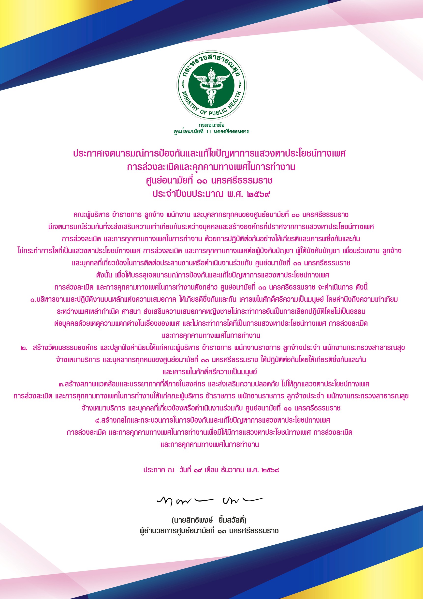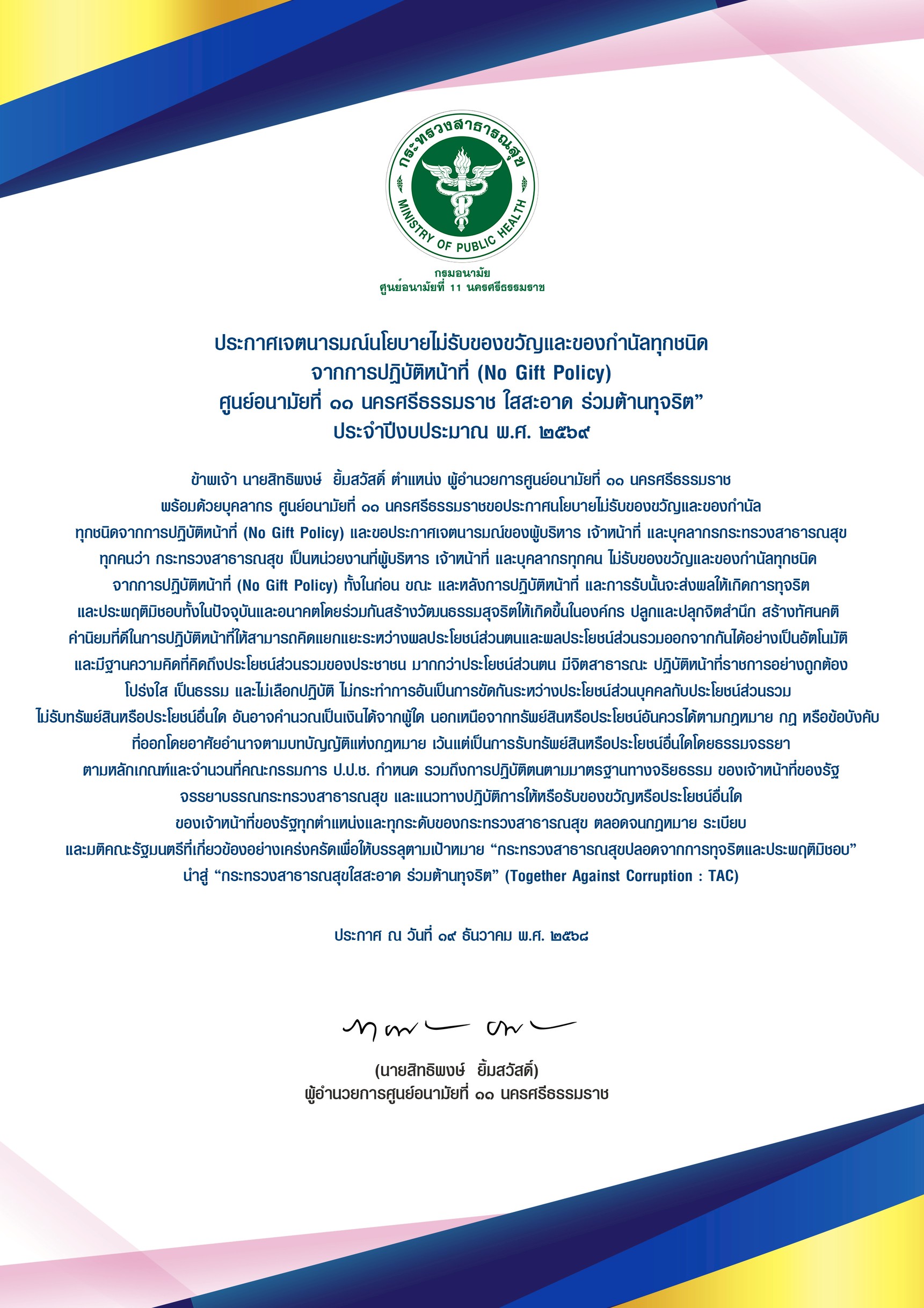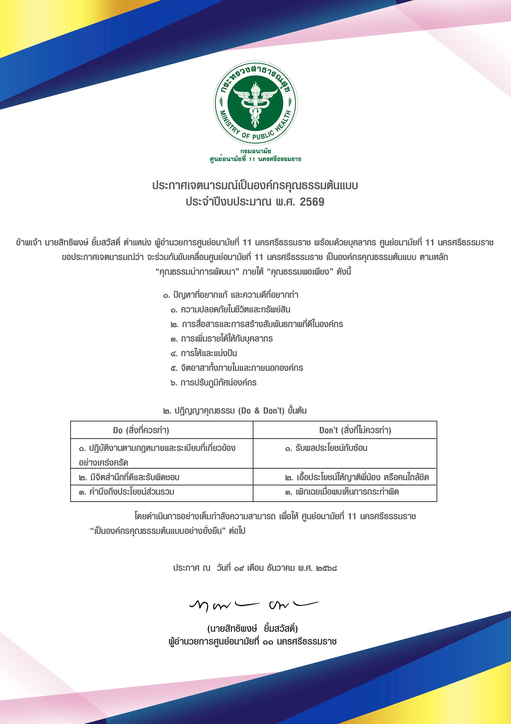 1.1 ประกาศเจตนารมณ์เป็นองค์กรคุณธรรมต้นแบบ ประจำปีงบประมาณ พ.ศ. 2569