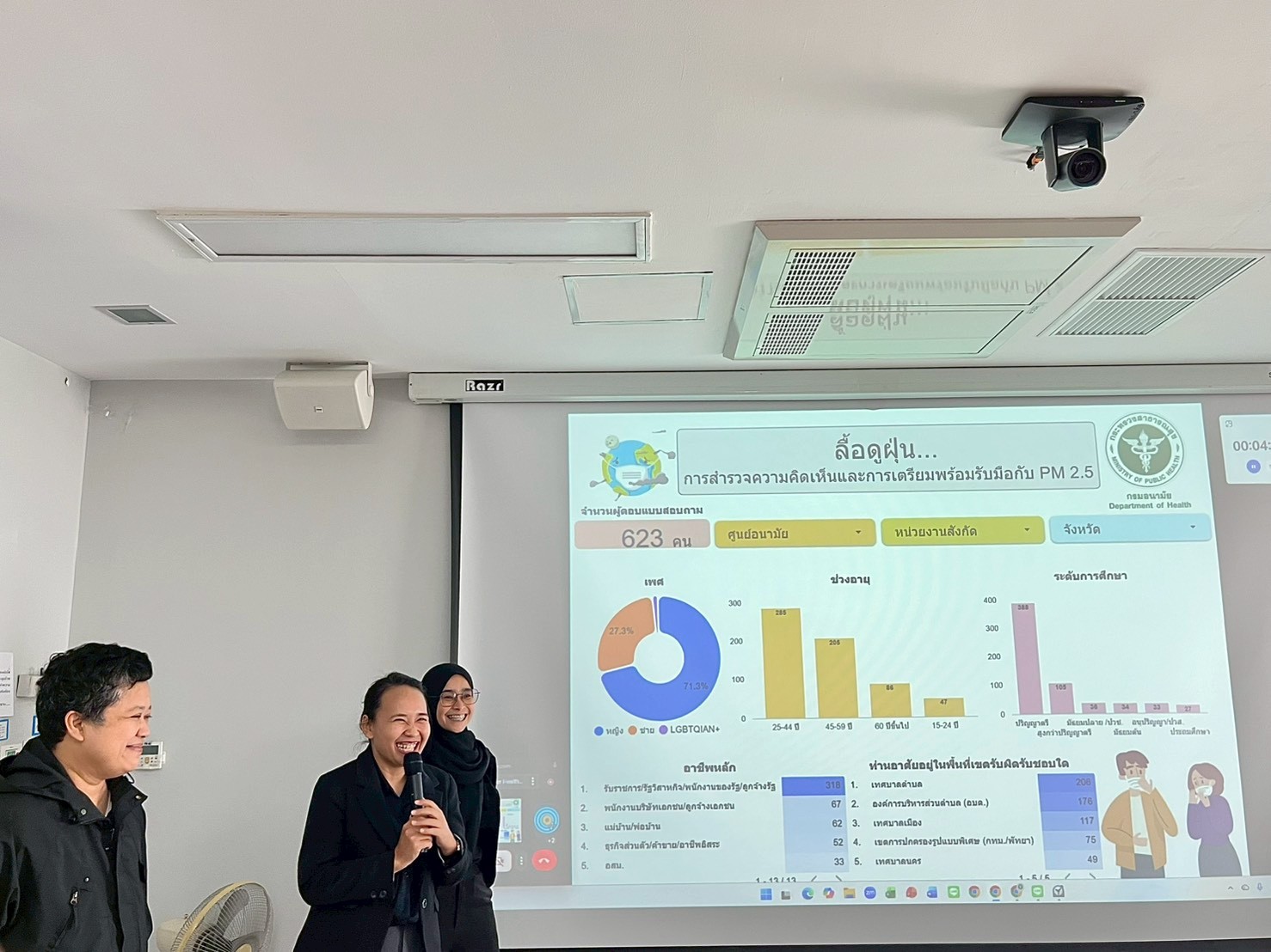 - การฝึกปฏิบัติออกแบบ Google Looker Studio เพื่อการวิเคราะห์และนำเสนอข้อมูลจากผลสำรวจอนามัยโพล ในรูปแบบกิจกรรมกลุ่ม ซึ่งมีชุดข้อมูลที่กลุ่มเลือกใช้และนำเสนอ ได้แก่ เมืองสุขภาพดี ลื้อดูฝุ่น ห้องปลอดฝุ่น เทศกาลตรุษจีน ร้อนนี้ต้องรอด เมืองสุขภาพดี ศูนย์พักพิง ร้านอาหารเมนูชูสุขภาพ ฟ.ฟันสะอาดยัง ชุมชนที่เป็นมิตรกับผู้สูงอายุ (AFC) และการดื่มนม