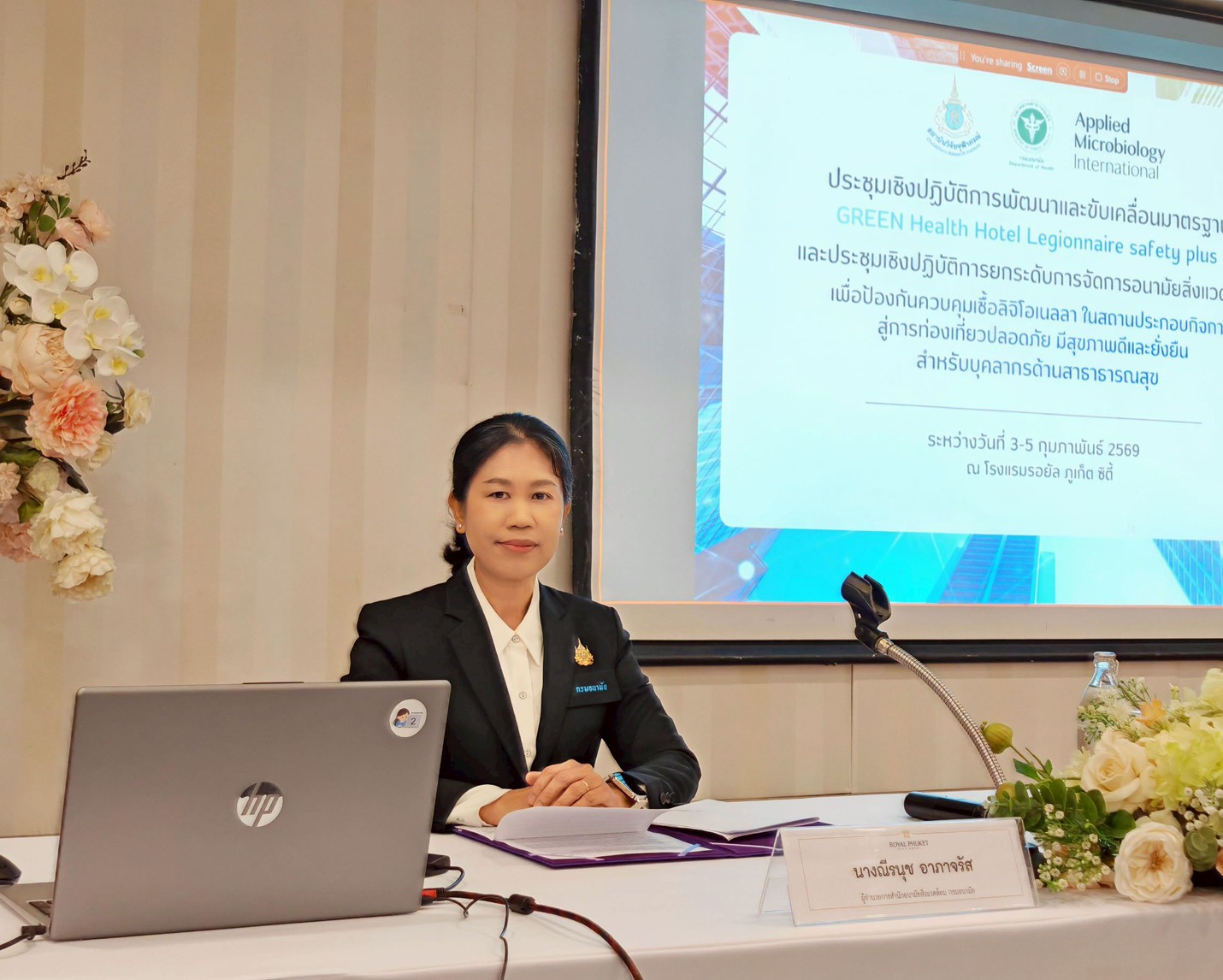 วันที่ 5 กุมภาพันธ์ พ.ศ.2569 นายแพทย์สิทธิพงษ์ ยิ้มสวัสดิ์ ผู้อำนวยการศูนย์อนามัยที่ 11 นครศรีธรรมราช มอบหมายตัวแทนจากกลุ่มงานอนามัยสิ่งแวดล้อม เข้าร่วมประชุมด้วยสำนักอนามัยสิ่งแวดล้อม กรมอนามัย ร่วมกับ Applied Microbiology International ประชุมเชิงปฏิบัติการยกระดับการจัดการอนามัยสิ่งแวดล้อมเพื่อป้องกันควบคุมเชื้อลีจิโอเนลลา ในสถานประกอบกิจการสู่การท่องเที่ยวปลอดภัย มีสุขภาพดีและยั่งยืน สำหรับบุคลากรด้านสาธาธารณสุข โดยมีวัตถุประสงค์เพื่อพัฒนาศักยภาพบุคลากรด้านสาธาธารณสุขของหน่วยงานภาคีเครือข่ายภาครัฐในการจัดการอนามัยสิงแวดล้อม ป้องกันควบคมเชื่อลีจโอเนลลาในสถานประกอบกิจการสนับสนุนการท่องเที่ยวอย่างยั่งยืงยืงยืนและบูรณาการความร่วมมือกับหน่วยงานภาคีเครือข่ายในการขับเคลื่อนมาตรการยกระดับการควบคุมคุมป้องกันการระบาดของโรคลีเจียนแนร์ ภายใต้กฎหมายว่าด้วยการสาธารณสุข ระหว่างวันที่ 3-5 กุมภาพันธ์ 2569 ณ โรงแรมรอยัล ภูเก็ต ซิตี้ จังหวัดภูเก็ต