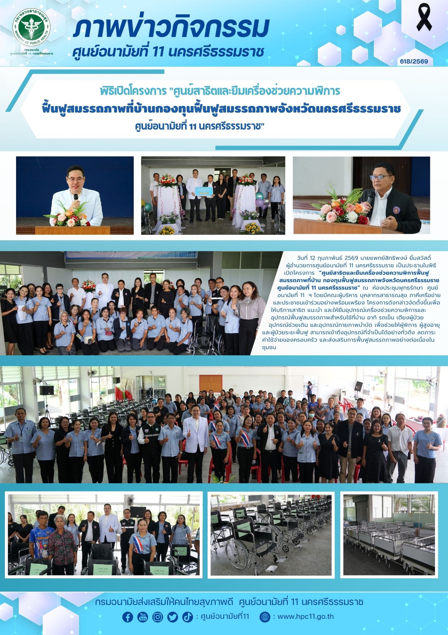 วันที่ 12 กุมภาพันธ์ 2569 นายแพทย์สิทธิพงษ์ ยิ้มสวัสดิ์ ผู้อำนวยการศูนย์อนามัยที่ 11 นครศรีธรรมราช เป็นประธานในพิธีเปิดโครงการ “ศูนย์สาธิตและยืมเครื่องช่วยความพิการฟื้นฟูสมรรถภาพที่บ้าน กองทุนฟื้นฟูสมรรถภาพจังหวัดนครศรีธรรมราช ศูนย์อนามัยที่ 11 นครศรีธรรมราช” ณห้องประชุมพุทธรักษาศูนย์อนามัยที่ 11ฯ โดยมีคณะผู้บริหาร บุคลากรสาธารณสุข ภาคีเครือข่าย และประชาชนเข้าร่วมอย่างพร้อมเพรียงโครงการดังกล่าวจัดตั้งขึ้นเพื่อให้บริการสาธิต แนะนำ และให้ยืมอุปกรณ์เครื่องช่วยความพิการและอุปกรณ์ฟื้นฟูสมรรถภาพสำหรับใช้ที่บ้าน อาทิ รถเข็น เตียงผู้ป่วย อุปกรณ์ช่วยเดิน และอุปกรณ์กายภาพบำบัด เพื่อช่วยให้ผู้พิการ ผู้สูงอายุ และผู้ป่วยระยะฟื้นฟู สามารถเข้าถึงอุปกรณ์ที่จำเป็นได้อย่างทั่วถึง ลดภาระค่าใช้จ่ายของครอบครัว และส่งเสริมการฟื้นฟูสมรรถภาพอย่างต่อเนื่องในชุมชน