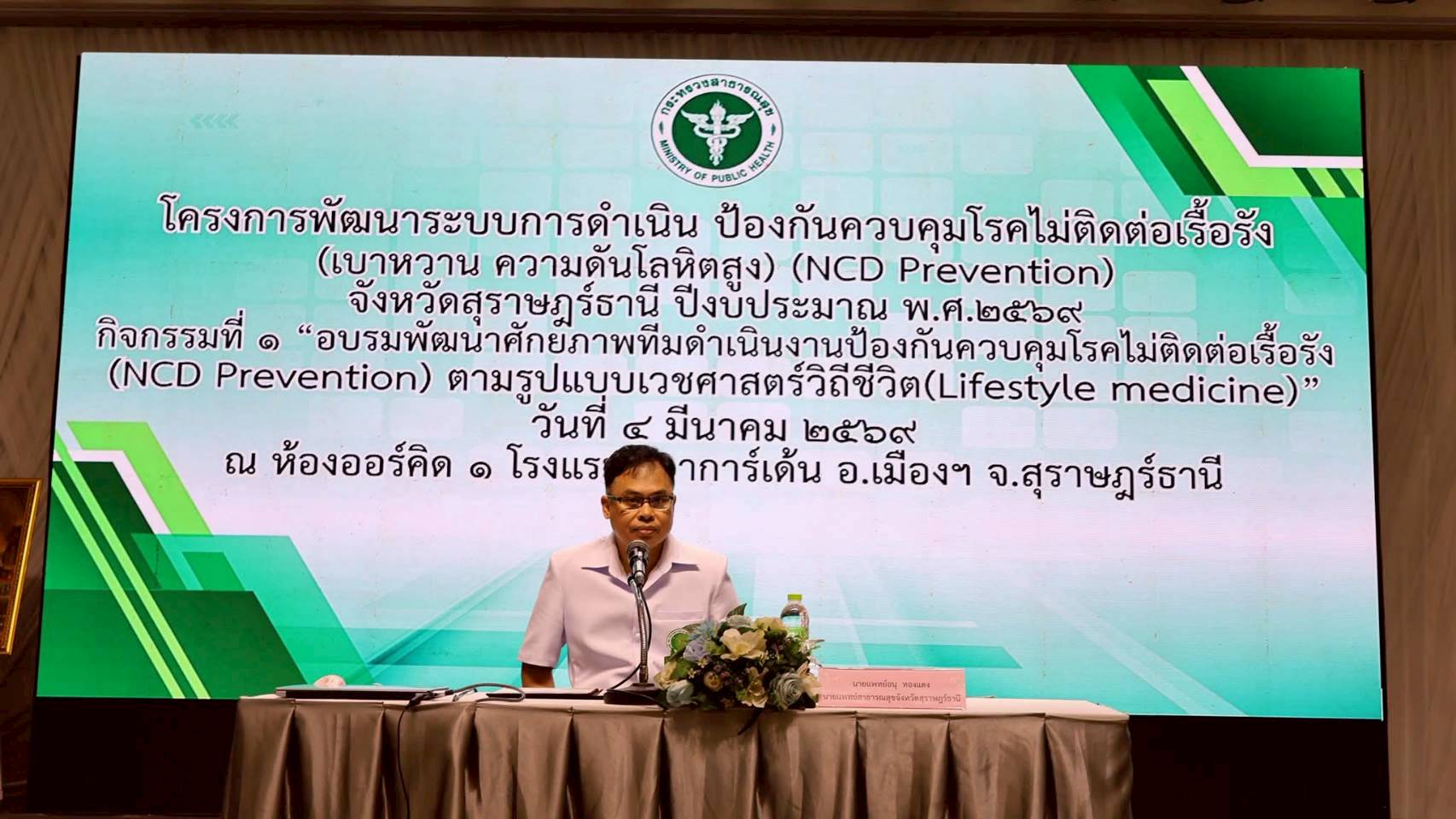ทยากรโครงการพัฒนาระบบการดำเนินงาน ป้องกันควบคุมโรคไม่ติดต่อเรื้อรัง (เบาหวาน ความดันโลหิตสูง) (NCD Prevention) จังหวัดสุราษฎร์ธานี ปีงบประมาณ พ.ศ. 2569
