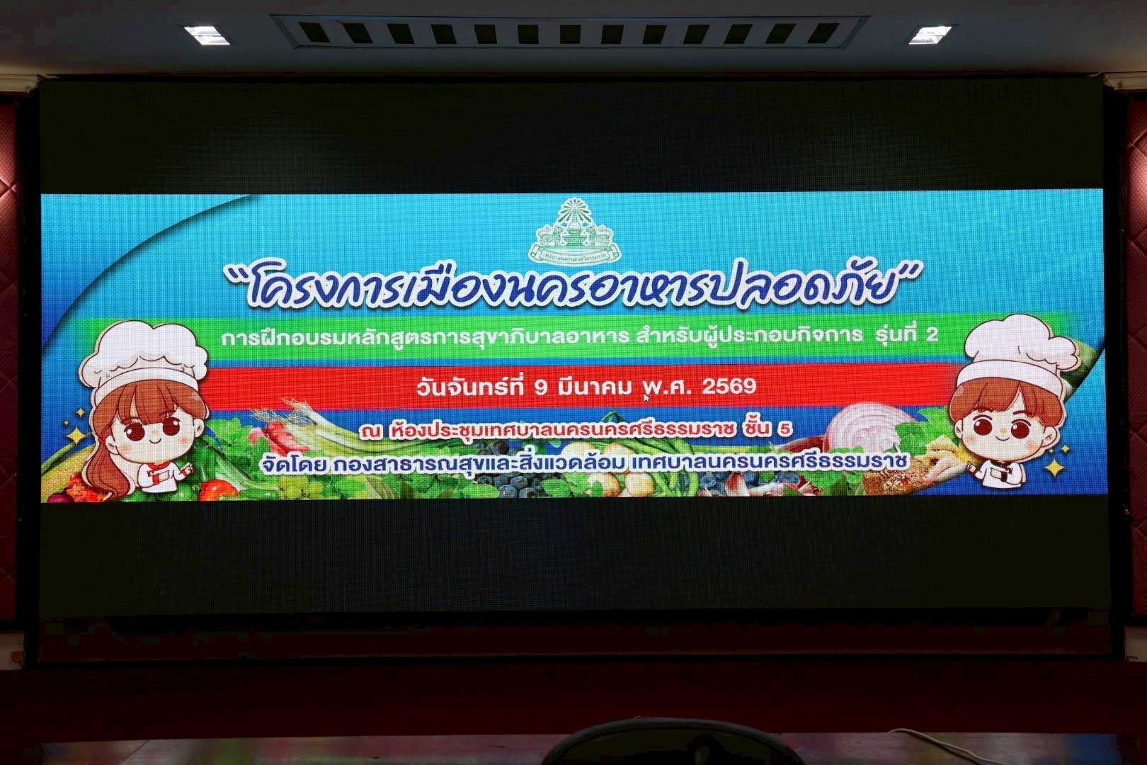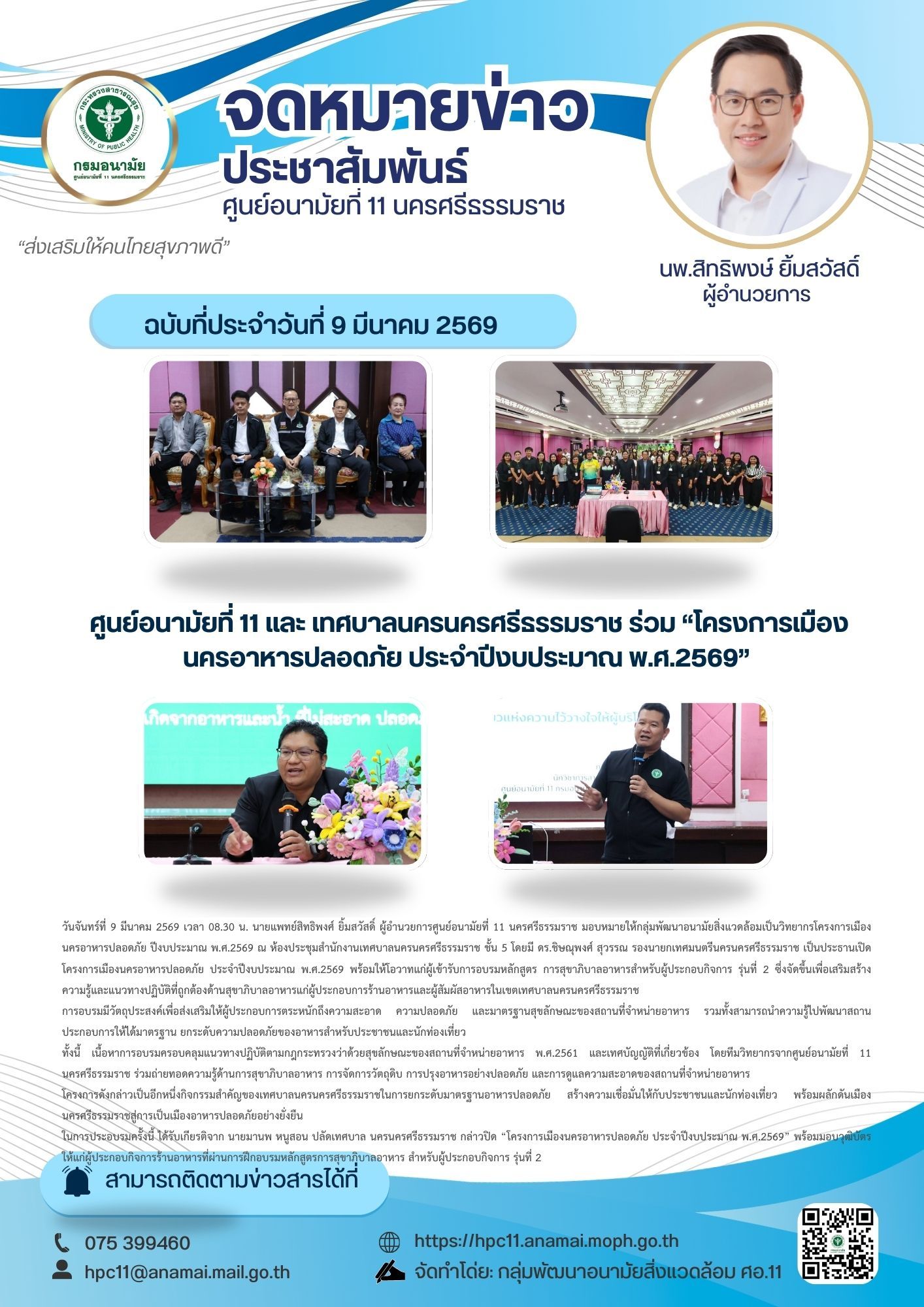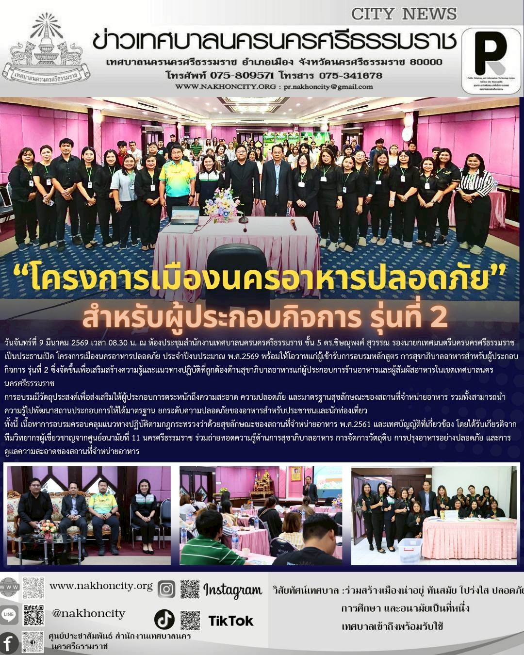 วันจันทร์ที่ 9 มีนาคม 2569 เวลา 08.30 น. นายแพทย์สิทธิพงศ์ ยิ้มสวัสดิ์ ผู้อำนวยการศูนย์อนามัยที่ 11 นครศรีธรรมราช มอบหมายให้กลุ่มพัฒนาอนามัยสิ่งแวดล้อมเป็นวิทยากรโครงการเมืองนครอาหารปลอดภัย ปีงบประมาณ พ.ศ.2569 ณ ห้องประชุมสำนักงานเทศบาลนครนครศรีธรรมราช ชั้น 5 โดยมี ดร.ชิษณุพงศ์ สุวรรณ รองนายกเทศมนตรีนครนครศรีธรรมราช เป็นประธานเปิด โครงการเมืองนครอาหารปลอดภัย ประจำปีงบประมาณ พ.ศ.2569 พร้อมให้โอวาทแก่ผู้เข้ารับการอบรมหลักสูตร การสุขาภิบาลอาหารสำหรับผู้ประกอบกิจการ รุ่นที่ 2 ซึ่งจัดขึ้นเพื่อเสริมสร้างความรู้และแนวทางปฏิบัติที่ถูกต้องด้านสุขาภิบาลอาหารแก่ผู้ประกอบการร้านอาหารและผู้สัมผัสอาหารในเขตเทศบาลนครนครศรีธรรมราช