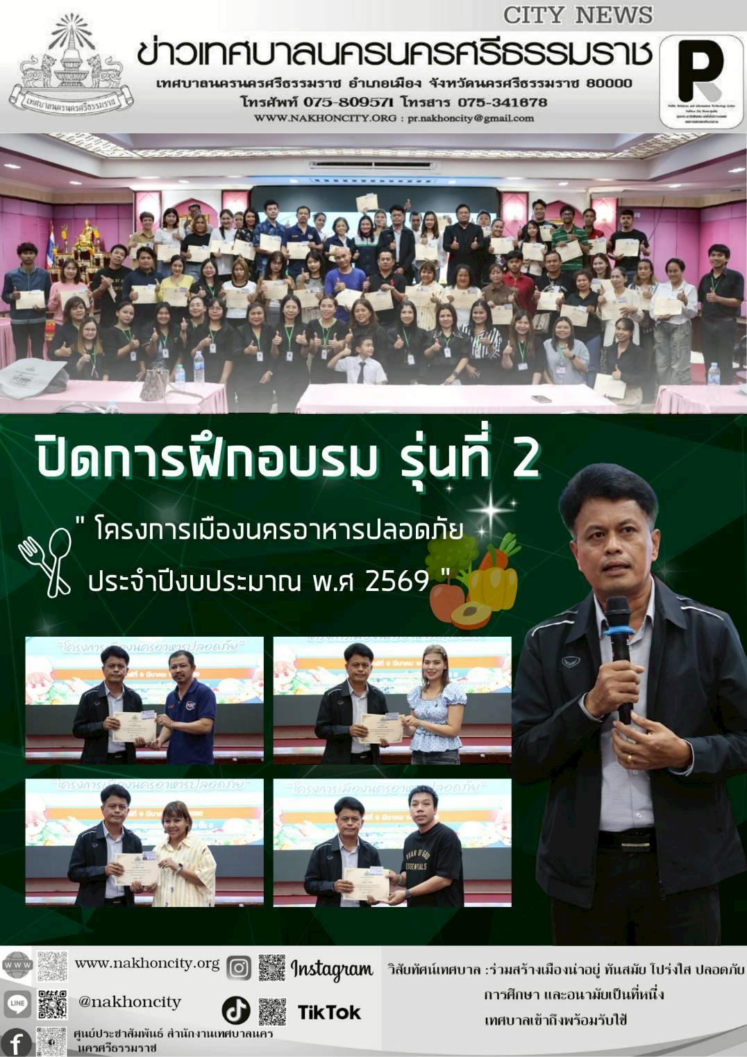 ในการประอบรมครั้งนี้ ได้รับเกียรติจาก นายมานพ หนูสอน ปลัดเทศบาล นครนครศรีธรรมราช กล่าวปิด “โครงการเมืองนครอาหารปลอดภัย ประจำปีงบประมาณ พ.ศ.2569” พร้อมมอบวุฒิบัตรให้แก่ผู้ประกอบกิจการร้านอาหารที่ผ่านการฝึกอบรมหลักสูตรการสุขาภิบาลอาหาร สำหรับผู้ประกอบกิจการ รุ่นที่ 2
