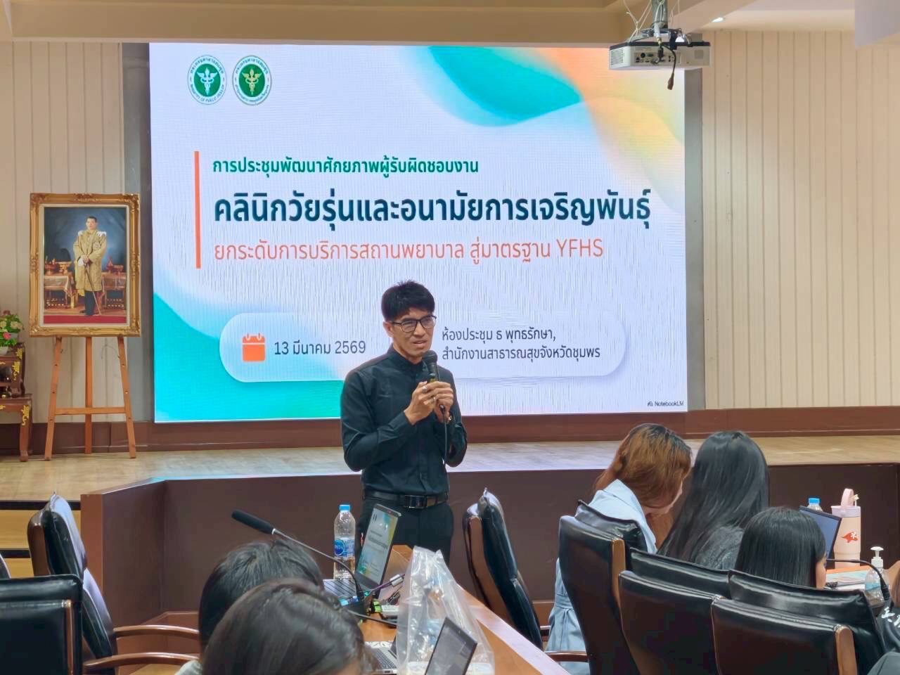 วันที่ 13 มีนาคม 2569 นายแพทย์สิทธิพงษ์ ยิ้มสวัสดิ์ ผู้อำนวยการศูนย์อนามัยที่ 11 นครศรีธรรมราช มอบหมายให้ผู้รับผิดชอบงานวัยรุ่น นำโดย ดร.วันชัย เยี่ยงกุลเชาว์ นักวิชาการสาธารณสุขชำนาญการพิเศษ หัวหน้ากลุ่มพัฒนาการส่งเสริมสุขภาพวัยเรียนวัยรุ่น และผู้รับผิดชอบงานวัยรุ่น เข้าร่วมเป็นวิทยากรโครงการประชุมพัฒนาศักยภาพผู้รับผิดชอบงานคลินิกวัยรุ่นในสถานพยาบาลตามมาตรฐาน YFHS และผู้รับผิดชอบงานอำเภออนามัยการเจริญพันธุ์ ณ ห้องประชุม ธ พุทธรักษา สำนักงานสาธารณสุขจังหวัดชุมพร โ ดยได้รับเกียรติจากนายแพทย์พงษ์เธียร พันพิพัฒไพบูลย์ รอง นพ.สสจ.ชุมพร เป็นประธานเปิดการประชุม ซึ่งการประชุมมีวัตถุประสงค์ เพื่อพัฒนาศักยภาพผู้รับผิดชอบงานวัยรุ่นในพื้นที่จังหวัดชุมพร ให้สามารถเข้าโปรแกรมเพื่อประเมินตนเองตามมาตรฐานบริการสุขภาพที่เป็นมิตรสำหรับวัยรุ่นและเยาวชน ฉบับ พ.ศ.2563 และการประเมินตนเองมาตรฐานการดำเนินงานป้องกันและแก้ไขการตั้งครรภ์ในวัยรุ่นระดับอำเภอได้ถูกต้อง และเข้ารับการประเมินตามมาตรฐานที่วางเป้าหมายไว้ ซึ่งมีผู้เข้าร่วมประชุม ได้แก่ ผู้รับผิดชอบงานวัยรุ่นจาก สสอ.สวี สสอ.ละแม รพ.สวี รพ.ปากน้ำหลังสวน รพ.ละแม สสอ.ท่าแซะ รพ.ชุมพรเขตอุดมศักดิ์ รพ.มาบอำมกฤต รพ.ปะทิว รพ.ทุ่งตะโก รพ.ปากน้ำชุมพร สสอ.เมืองชุมพร รพ.พะโต๊ะ สสอ.พะโต๊ะ และรพ.ท่าแซะ รวมทั้งหมด 50 คน นอกจากนี้การประชุมดังกล่าวทำให้ทราบถึงปัญหา อุปสรรคในการขับเคลื่อนการดำเนินงานในพื้นที่ เริ่มตั้งแต่ขั้นตอนการประเมินตนเอง ที่ต้องรวบรวมข้อมูลเพื่อลงบันทึกโปรแกรมมาตรฐานบริการสุขภาพที่เป็นมิตรสำหรับวัยรุ่นและเยาวชน ฉบับ พ.ศ.2563 และมาตรฐานการดำเนินงานป้องกันและแก้ไขการตั้งครรภ์ในวัยรุ่นระดับอำเภอ ที่ต้องอาศัยความร่วมมือจากทุกภาคส่วน และภาคีเครือข่ายที่เกี่ยวข้อง เพื่อให้สามารถผ่านขั้นตอนนี้ไปได้และเข้าสู่การรับการประเมินต่อไป ซึ่งในที่ประชุมได้มีการแลกเปลี่ยนเรียนรู้ เสนอแนวทางรวบรวมข้อมูลดังกล่าว โดยมีการเสนอให้ผู้อำนวยการในพื้นที่นั้นๆ เข้ามามีบทบาทเป็นประธาน เปรียบเสมือนเป็นศูนย์กลางของหน่วยบัญชาการในการขับเคลื่อนการดำเนินงาน เพื่อให้ทุกหน่วยงาน หรือภาคีเครือข่ายที่เกี่ยวข้องได้รับรู้ข้อมูล แผนงานและมีการดำเนินงานไปในทิศทางเดียวกัน ทีมวิทยากร