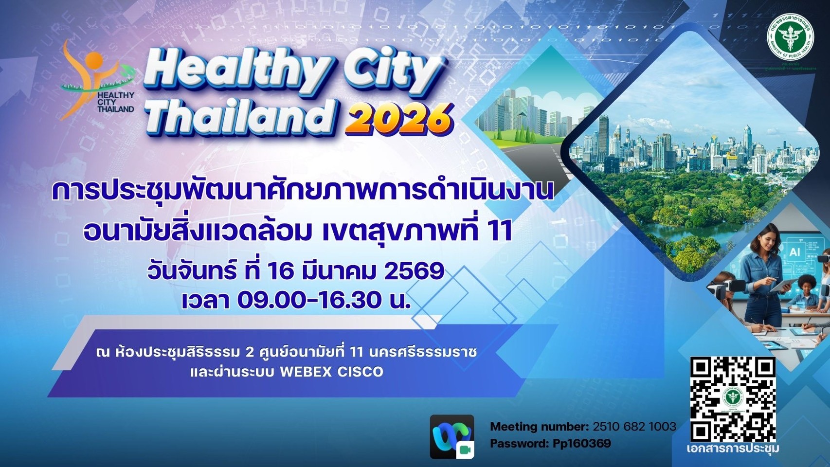 วันที่ 16 มีนาคม 2569 นายแพทย์สิทธิพงษ์ ยิ้มสวัสดิ์ ผู้อำนวยการศูนย์อนามัยที่11 นครศรีธรรมราช มอบหมายให้คณะกรรมการเมืองสุขภาพดี เขตสุขภาพที่ 11 จัดประชุมพัฒนาศักยภาพการดำเนินงานอนามัยสิ่งแวดล้อม เขตสุขภาพที่ 11 (ประเด็นเมืองสุขภาพดี) ภายใต้โครงการพัฒนาระบบการจัดการอนามัยสิ่งแวดล้อมและสร้างการมีส่วนร่วมของภาคีเครือข่าย ณ ห้องประชุมสิริธรรม 2 ศูนย์อนามัยที่ 11 นครศรีธรรมราช เพื่อเตรียมความพร้อมการขับเคลื่อนและการประเมินรับรองเมืองสุขภาพดี ประจำปี 2569 แก่อปท.ที่สมัครเข้าร่วมเมืองสุขภาพดี ปีงบประมาณ 2569